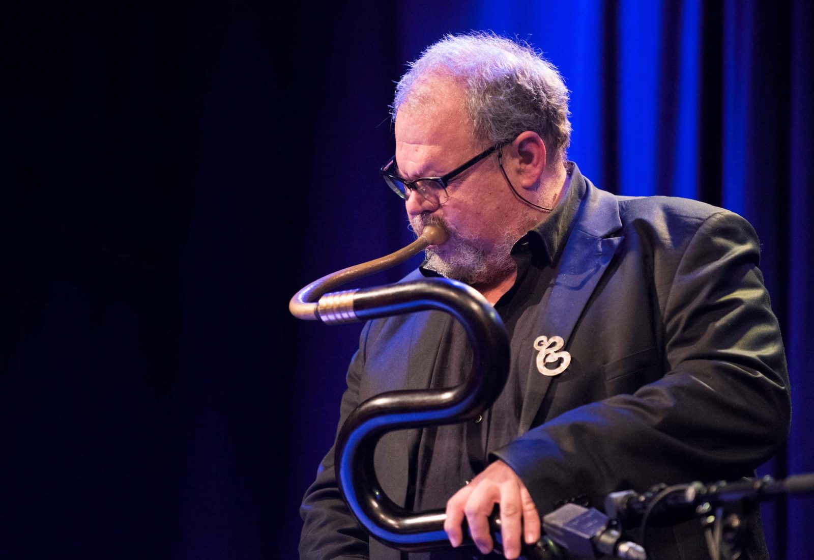 Michel Godard am Serpent (Vorläufer der Tuba), ist ein musikalischer Wanderer, der sich mit einem tiefen und breiten Musikverständnis und einer Leichtigkeit zwischen Barockmusik und Jazz bewegt. Mit seinem Spiel erkundet und lotet er immer wieder die eigenen Grenzen aus, schafft neue Klangwelten durch brillante Improvisation, Flexibilität am Instrument und Innovation. Hier auch der Eintrag auf Wikipedia.